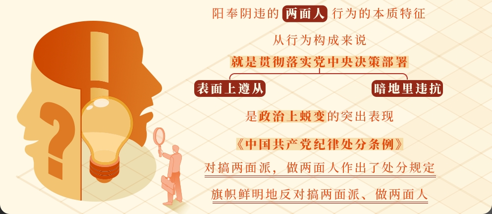 《中國共產(chǎn)黨紀律處分條例》規(guī)定,對黨不忠誠不老實,表里不一,陽奉陰違,欺上瞞下,搞兩面派,做兩面人,在政治上造成不良影響的,給予警告或者嚴重警告處分;情節(jié)較重的,給予撤銷黨內(nèi)職務或者留黨察看處分;情節(jié)嚴重的,給予開除黨籍處分。我們黨始終旗幟鮮明地反對搞兩面派、做兩面人。黨章第三條將“對黨忠誠老實,言行一致”,“反對陽奉陰違的兩面派行為和一切陰謀詭計”作為黨員必須履行的義務,將“對黨忠誠”寫入入黨誓詞?!蛾P于新形勢下黨內(nèi)政治生活的若干準則》規(guī)定,“黨的各級組織和全體黨員必須對黨忠誠老實、光明磊落,說老實話、辦老實事、做老實人”,“反對搞兩面派、做‘兩面人’”。大量案件表明,黨內(nèi)一些人在這方面問題突出,說一套、做一套,臺上一套、臺下一套,當面一套、背后一套,隱藏很深,危害很大。陽奉陰違的兩面人行為的本質(zhì)特征,從行為構(gòu)成來說,就是貫徹落實黨中央決策部署表面上遵從,暗地里違抗,是政治上蛻變的突出表現(xiàn)。此次《條例》修訂,將2018年《條例》相關條款中的“情節(jié)較輕”修改為“在政治上造成不良影響”,更進一步明確了陽奉陰違的兩面人行為必須具有政治危害。衡量是否屬于搞兩面派、做兩面人,根本標準就是政治標準,就是對黨是否忠誠老實,看表里行為是否體現(xiàn)突出的兩面性和政治危害性。搞兩面派,做兩面人的行為,違背黨員義務,損害黨的團結(jié)和統(tǒng)一,損害黨和人民利益,渙散黨的組織,透支黨的信譽,損害黨的形象,危害很大。黨員、干部必須嚴格遵守黨章、準則要求,對照《條例》規(guī)定,切實做到對黨組織忠誠老實、襟懷坦白、言行一致。