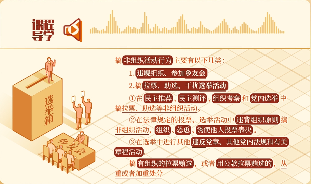 黨內(nèi)選舉是黨內(nèi)政治生活的重要組成部分。《關(guān)于新形勢下黨內(nèi)政治生活的若干準(zhǔn)則》規(guī)定,黨內(nèi)選舉必須體現(xiàn)選舉人意志,堅決防止和查處拉票賄選等行為。在選舉活動中搞非組織活動,干擾選舉人表達(dá)選舉意愿,侵犯其他被選舉人權(quán)益,侵蝕黨內(nèi)政治文化,在黨員群眾中造成不良影響,對這類違反組織紀(jì)律的行為必須予以堅決懲治。