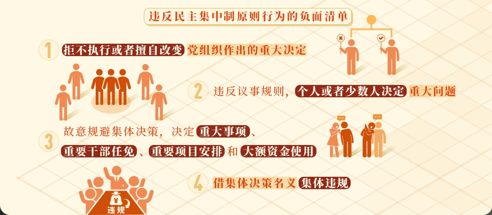 《中國共產(chǎn)黨紀律處分條例》第七十七條對違反民主集中制原則的行為作出處分規(guī)定。可分為四類:1. 拒不執(zhí)行或者擅自改變黨組織作出的重大決定。重大決定,主要是指黨組織按照議事規(guī)則和決策程序作出的有關(guān)工作任務(wù)部署,干部任免、調(diào)整和處理等決定,對黨組織成員具有約束力,必須服從和執(zhí)行。只要有拒不執(zhí)行或者擅自改變當中任何一種情形,均構(gòu)成違紀。2. 違反議事規(guī)則,個人或者少數(shù)人決定重大問題。主要指違反黨章中“凡屬重大問題都要按照集體領(lǐng)導、民主集中、個別醞釀、會議決定的原則,由黨的委員會集體討論,作出決定”的規(guī)定,以及各級黨組織制定的具體議事規(guī)則和決策程序。3. 故意規(guī)避集體決策,決定重大事項、重要干部任免、重要項目安排和大額資金使用。故意規(guī)避集體決策,主要是指個人或少數(shù)人故意違反有關(guān)議事規(guī)則和決策程序,不以集體討論、會議決定的形式對職責權(quán)限內(nèi)的“三重一大”事項作出決策,或者緊急情況下由個人或少數(shù)人臨時決定,事后未及時向班子報告等。4. 借集體決策名義集體違規(guī)。這種違紀行為雖然符合集體議事規(guī)則和決策程序,但有集體違規(guī)決策的事實,集體決策程序成為掩飾集體違規(guī)目的的手段和幌子。黨是根據(jù)自己的綱領(lǐng)和章程,按照民主集中制組織起來的統(tǒng)一整體。嚴肅黨內(nèi)生活,最根本的是認真執(zhí)行黨的民主集中制。執(zhí)紀監(jiān)督中發(fā)現(xiàn),有的黨員領(lǐng)導干部我行我素、獨斷專行,對黨組織的重大決定置若罔聞;有的搞家長制、一言堂,習慣于逢事先定調(diào),重大問題不經(jīng)班子成員充分醞釀和討論就拍板,甚至對多數(shù)人的意見也置之不理;有的故意規(guī)避集體決策程序,把個人意見強加給集體、強加給組織,用個人決定代替組織決定;有的以“開會研究”為幌子,將集體決策程序作為掩飾集體違規(guī)的手段等。因此,《條例》明確對獨斷專行或各自為政,議而不決、決而不行、行而不實,以黨委集體決策名義集體違規(guī)等這些問題進行紀律責任追究,給予警告或者嚴重警告處分;情節(jié)嚴重的,給予撤銷黨內(nèi)職務(wù)或者留黨察看處分。
