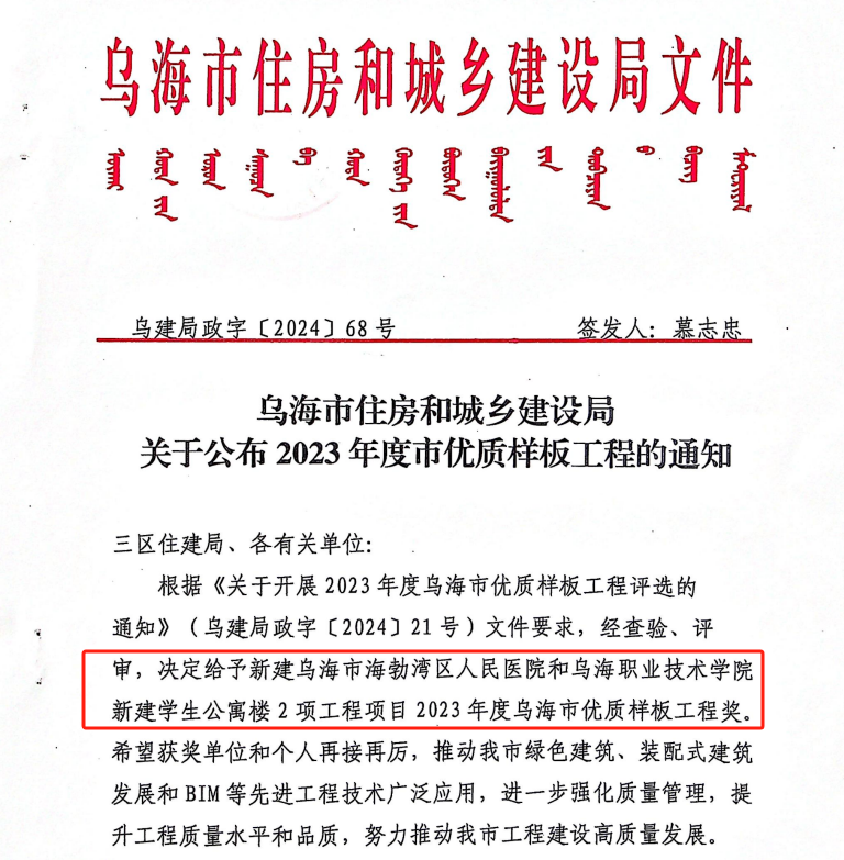 近日,烏海市住房和城鄉(xiāng)建設(shè)局發(fā)布了《關(guān)于公布2023年度市優(yōu)質(zhì)樣板工程的通知》名單,由城建公司承建的烏海市職業(yè)技術(shù)學(xué)院新建學(xué)生公寓樓項(xiàng)目榮獲2023年度烏海市優(yōu)質(zhì)樣板工程獎(jiǎng)。