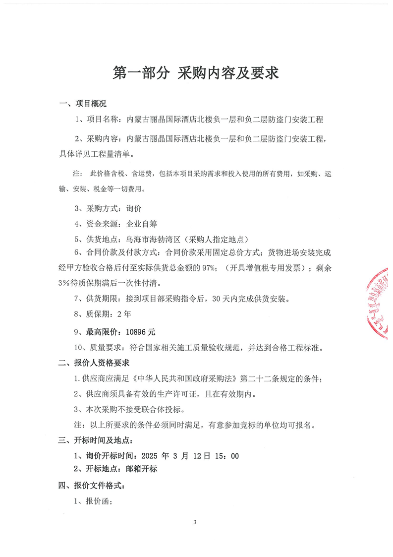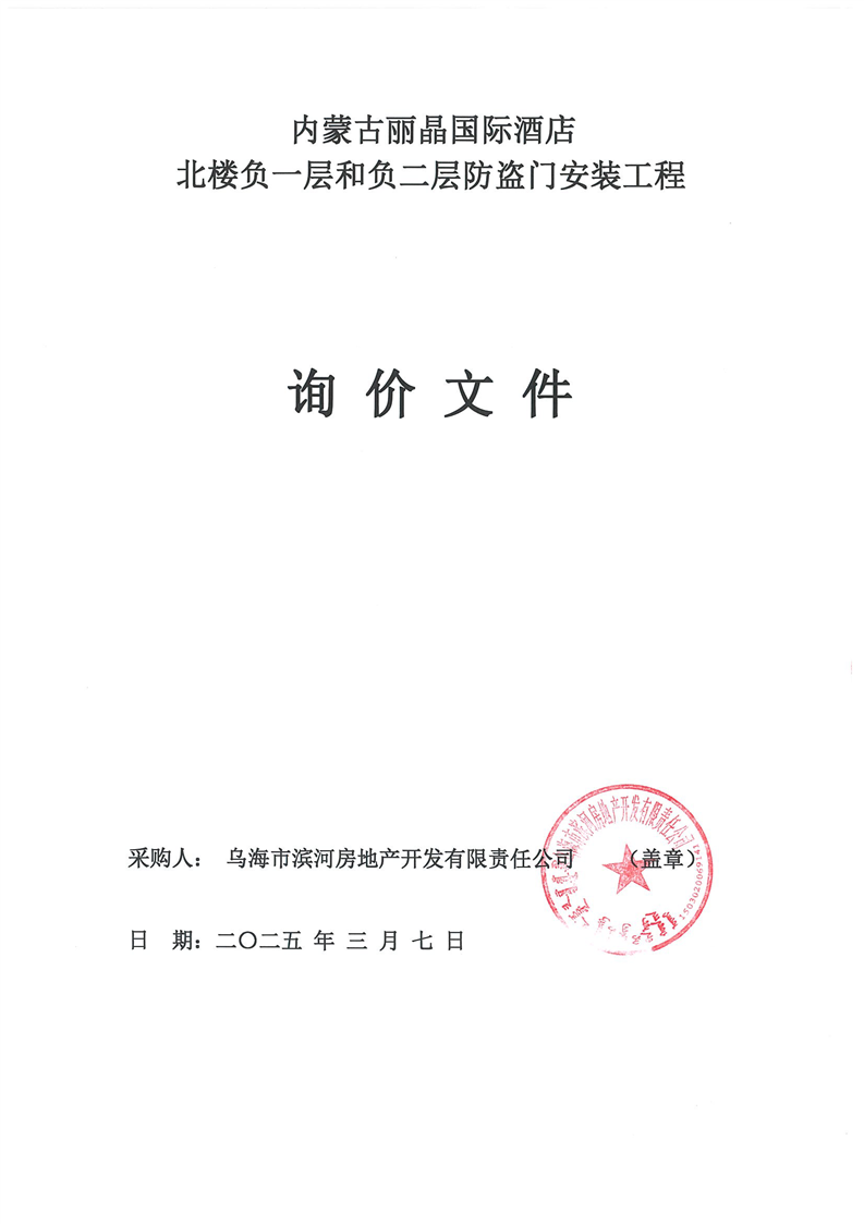 內(nèi)蒙古麗晶國際酒店北樓負(fù)一層和負(fù)二層防盜門安裝工程詢價(jià)文件