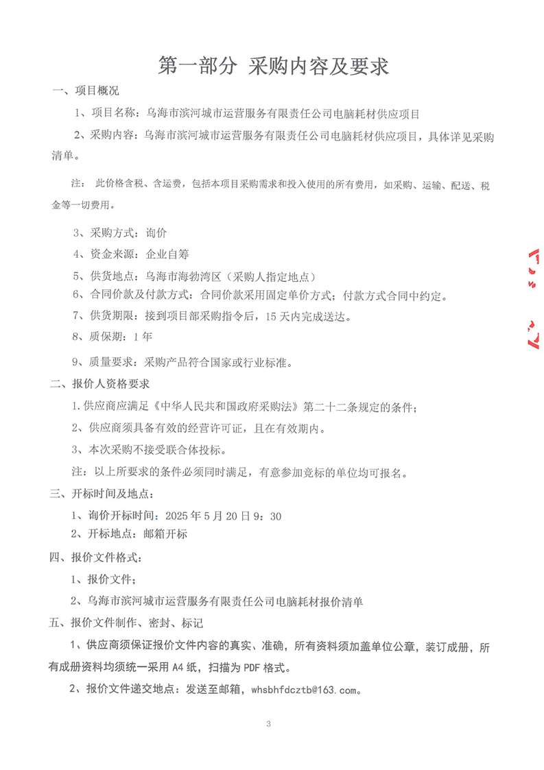 烏海市濱河城市運(yùn)營服務(wù)有限責(zé)任公司電腦耗材供應(yīng)商詢價文件