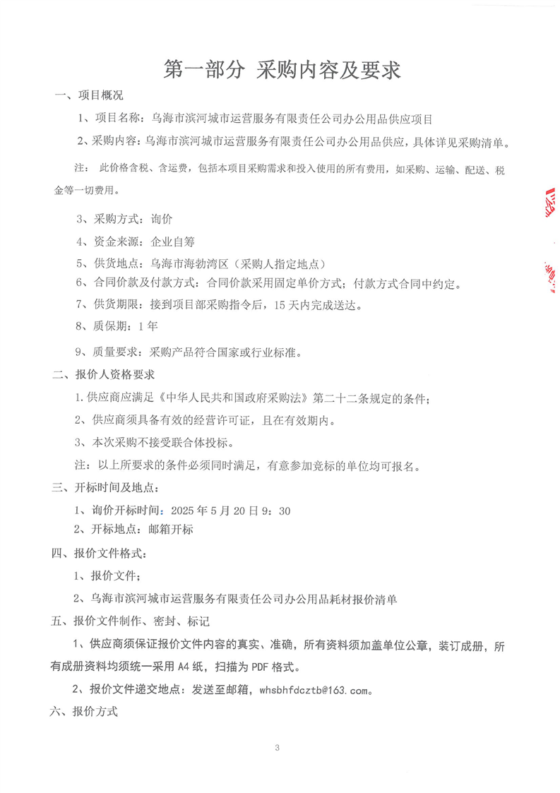 烏海市濱河城市運(yùn)營(yíng)服務(wù)有限責(zé)任公司辦公用品供應(yīng)商詢價(jià)文件