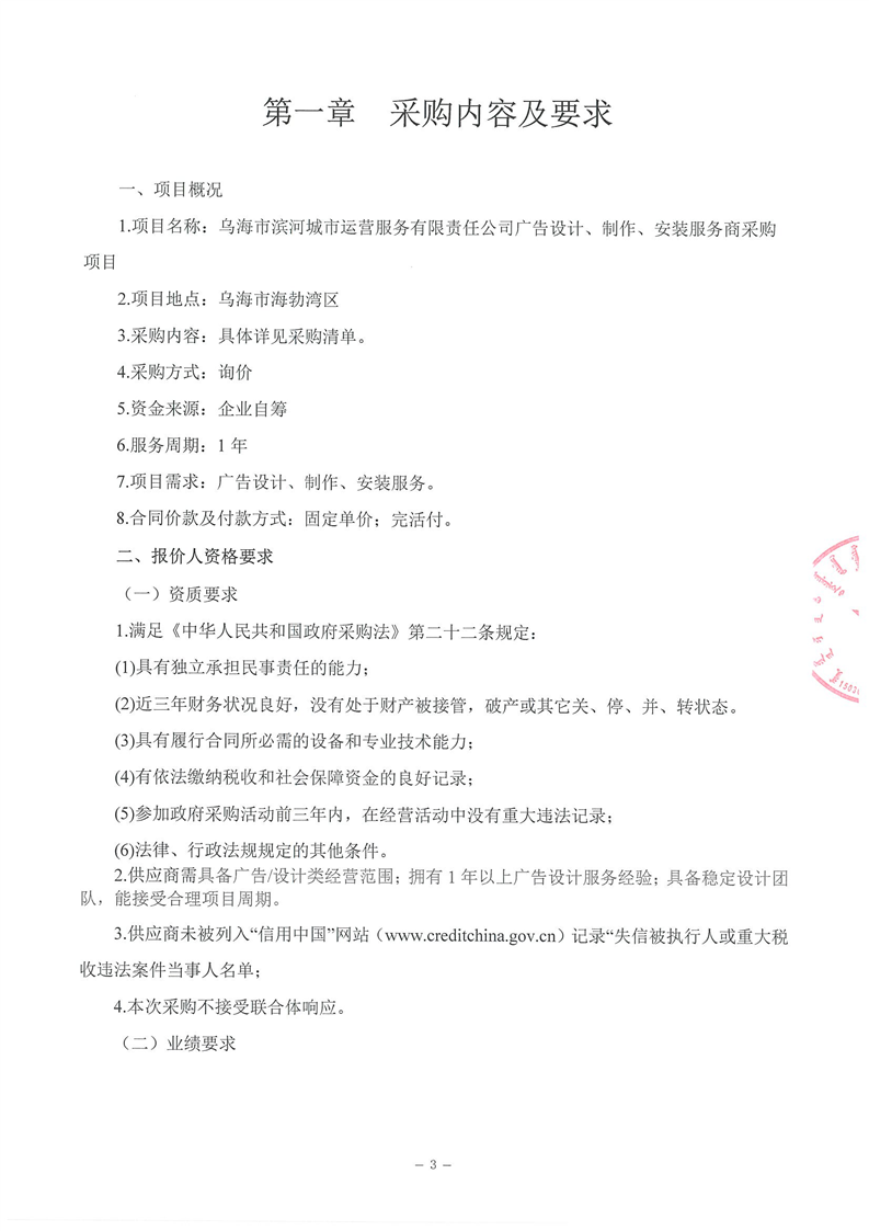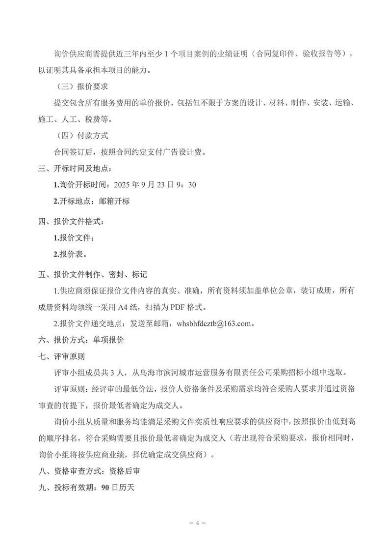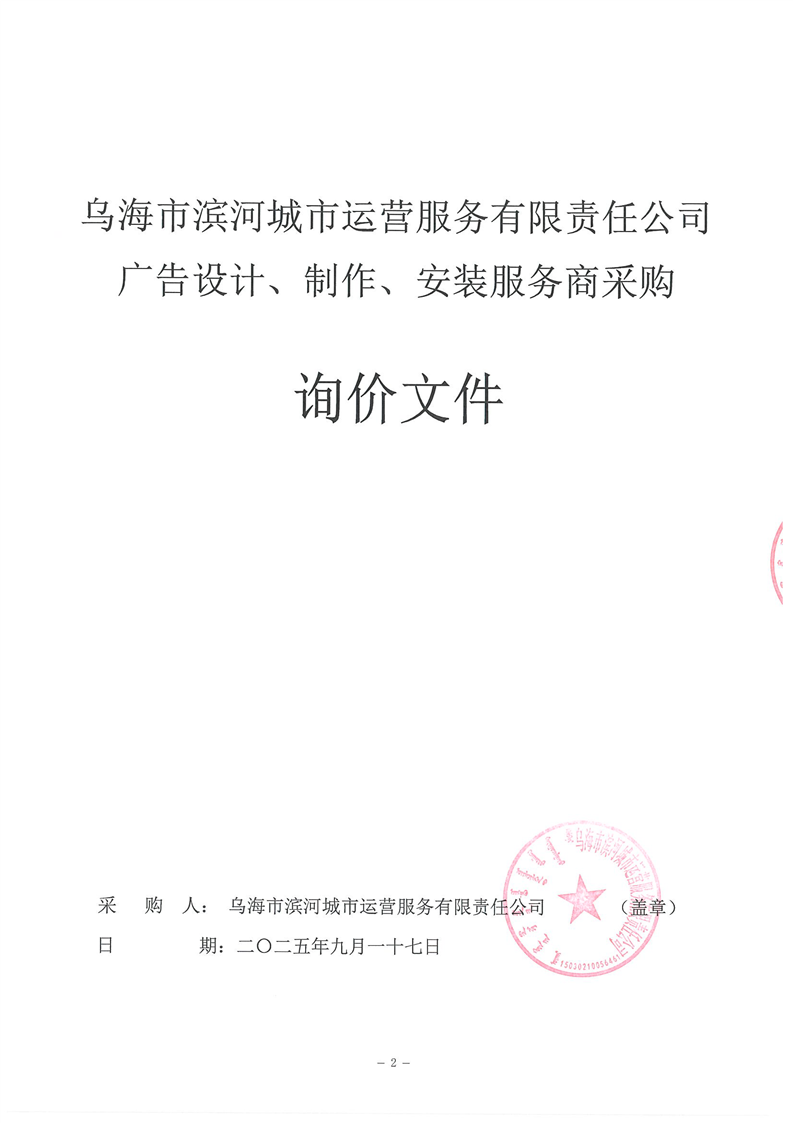 烏海市濱河城市運(yùn)營服務(wù)有限責(zé)任公司廣告設(shè)計、制作、安裝服務(wù)商采購詢價文件
