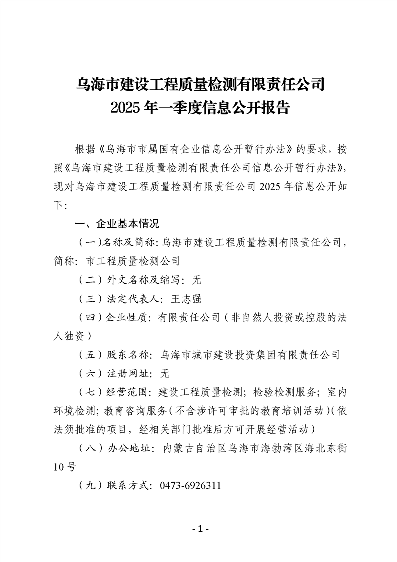 烏海市建設(shè)工程質(zhì)量檢測有限責(zé)任公司2025年一季度信息公開