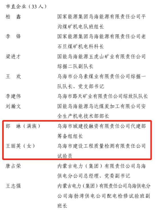 9月1日,中共烏海市委員會發(fā)布《烏海市委、市人民政府關(guān)于表彰烏海市勞動模范和先進(jìn)工作者的決定》,其中城投集團(tuán)公司四名職工郎琳、王麗英、司樹軍、唐濤被授予“烏海市勞動模范”稱號。