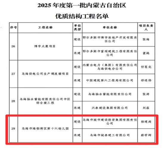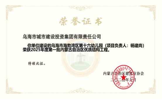 近日,市城投集團(tuán)公司代建實(shí)施的烏海市海勃灣區(qū)第十六幼兒園項(xiàng)目,榮獲2025年度第一批內(nèi)蒙古自治區(qū)優(yōu)質(zhì)結(jié)構(gòu)工程。
