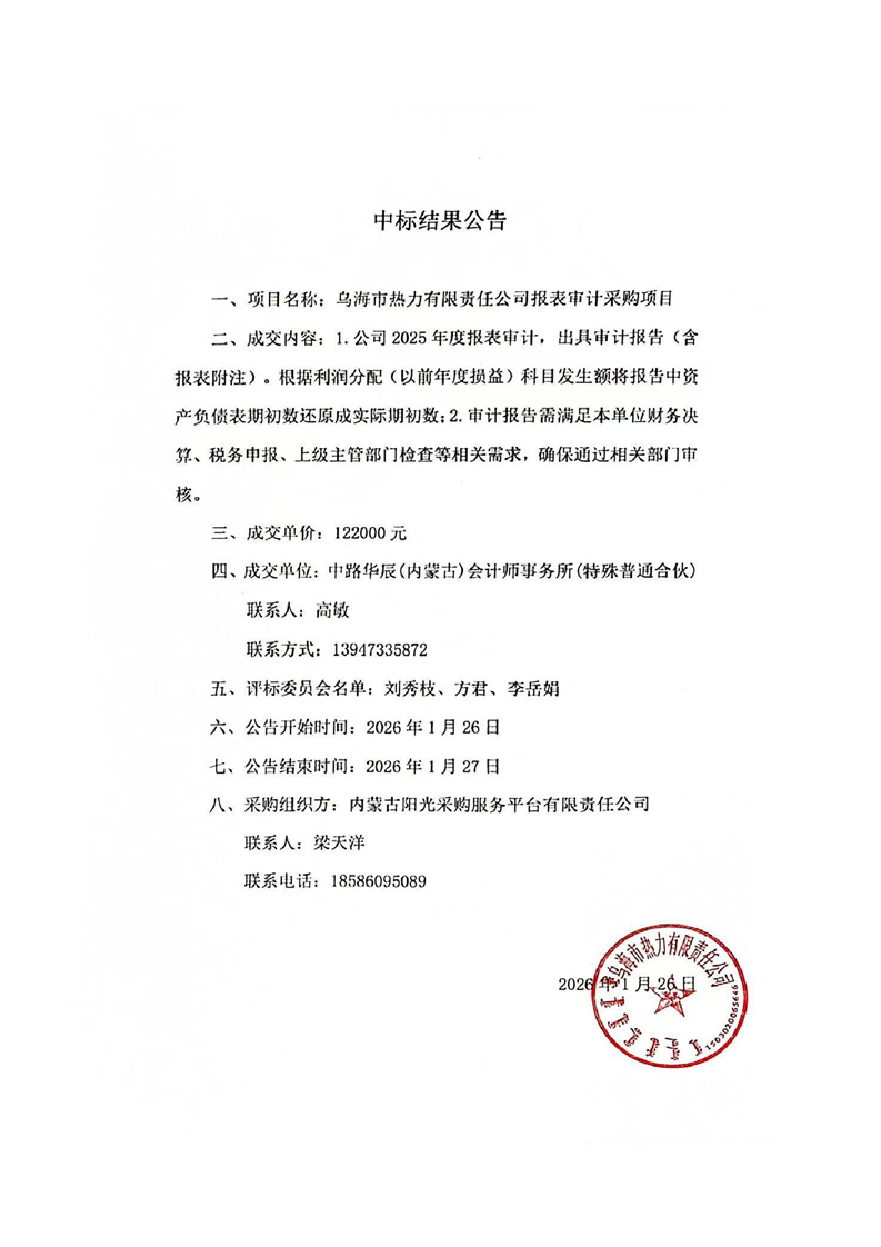 烏海市熱力有限責(zé)任公司報(bào)表審計(jì)采購(gòu)項(xiàng)目中標(biāo)結(jié)果公告